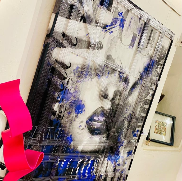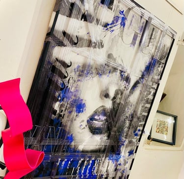 In dialogue with the masters who have inspired her — Warhol, Haring, Pierre Soulages, Matisse, Banksy, McCurry, Vivian Maier — I see in her works an original synthesis. From Warhol she inherits reflection on fame as material; from Haring, the sense of sign as accessible language; from Soulages, reverence for matter; from Matisse, chromatic boldness; from McCurry and Maier, a passion for the gaze that tells a story. Yet Sylvie does not merely accumulate: she translates these legacies into a personal code that uses fragmentation to restitute complexity, and protection to foster empathy.