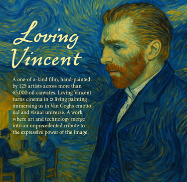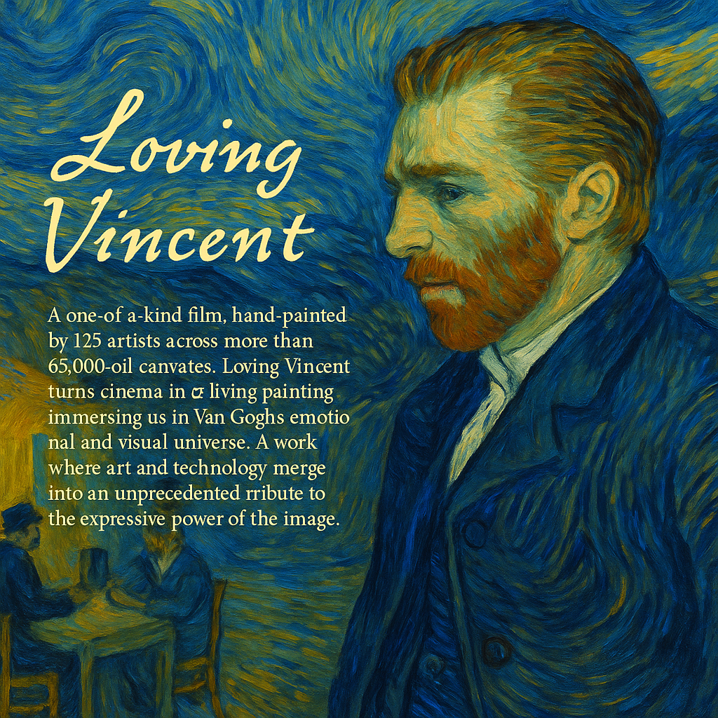 A one-of-a-kind film, hand-painted by 125 artists across more than 65,000 oil canvases. Loving Vincent turns cinema into living painting, immersing us in Van Gogh’s emotional and visual universe. A work where art and technology merge into an unprecedented tribute to the expressive power of the image.