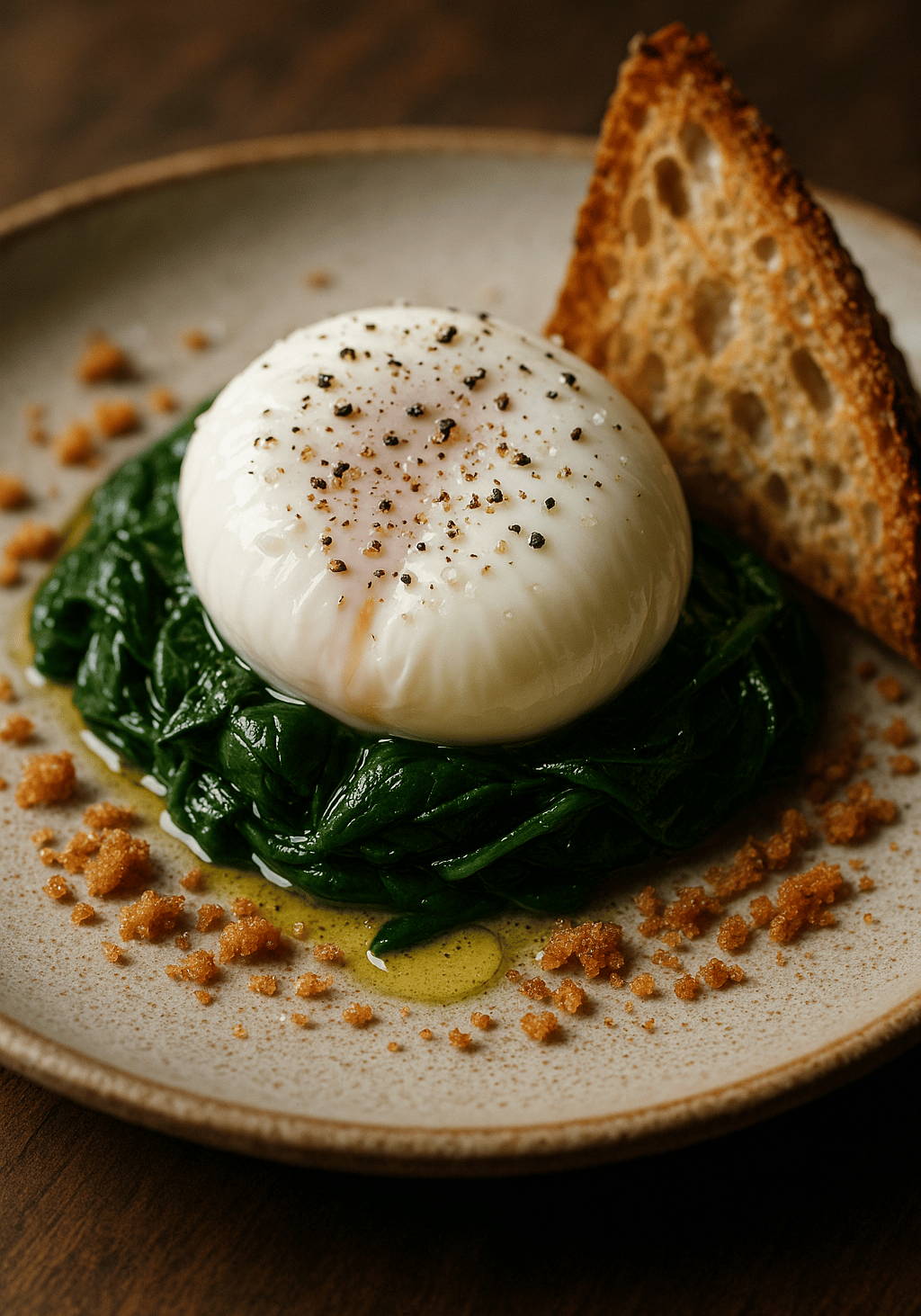 Poached Egg with Wilted Spinach and Toasted Crumb — a ritual of serene decadence inspired by M.F.K. Fisher’s The Art of Eating. Discover how simplicity unfolds into poetry on the plate, a quiet meditation of flavor and grace in everyday life.