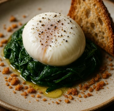 There is a particular elegance in restraint. A poached egg, warm and trembling like a held breath, laid upon a bed of buttered spinach — not flamboyant, but precise, contemplative, sensual.