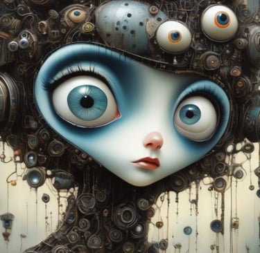 Jarre, already known globally for Oxygène (1976) and his pioneering electronic soundscapes, brings to Promptitude something new: a precise sensibility towards the minimal, the liminal. Here, the “prompt” is no longer simply a tool — it is rendered into a haiku, an instruction ritual, a compact invocation. These whispered textual sparks are set loose upon artificial intelligence, which responds not with mere replication but with hybrid portraits: beings suspended between organic skin and algorithmic geometry, oscillating between what is human and what is mechanical.