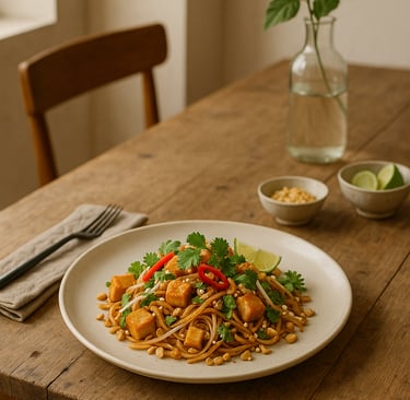 In reinterpreting the experience of Relational Pad Thai, inspired by the gentle yet radical poetics of Rirkrit Tiravanija, we cannot limit ourselves to taste alone: the entire space must become the artwork. The minimalist plating—with noodles gathered at the center and garnishes arranged like calibrated marks on a white canvas—recalls the visual grammar of conceptual installations, where every element is simultaneously form, balance, and intention. But art does not end on the plate: it lives in the table, the materials, the light, the collective gesture of serving. I imagine a long, raw surface—perhaps reclaimed wood—free of tablecloths but inhabited by rich textures, where the tableware consists of handcrafted ceramics in matte, porous tones, chosen to highlight the vibrant contrast between the amber of tamarind, the glossy green of fresh herbs, and the vivid red of chili. No individual place settings—only shared bowls, unlabeled bottles, and crumpled natural linen placemats. The ideal environment is an open space where the kitchen is not hidden but offered as an integral part of the installation: here, preparation is performance, aroma is language, the meal is relationship. The light is warm, grazing, directional—designed to welcome rather than display. And after all, what happens when an artist places a frying pan at the center of a museum? The scene reverses, the audience gets their hands dirty, and the gesture gains meaning. It happens that, between a bite and a smile, we discover that even the design of space can nourish. And what if this were exactly where the next chapter begins?